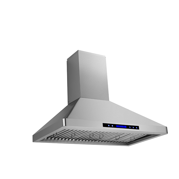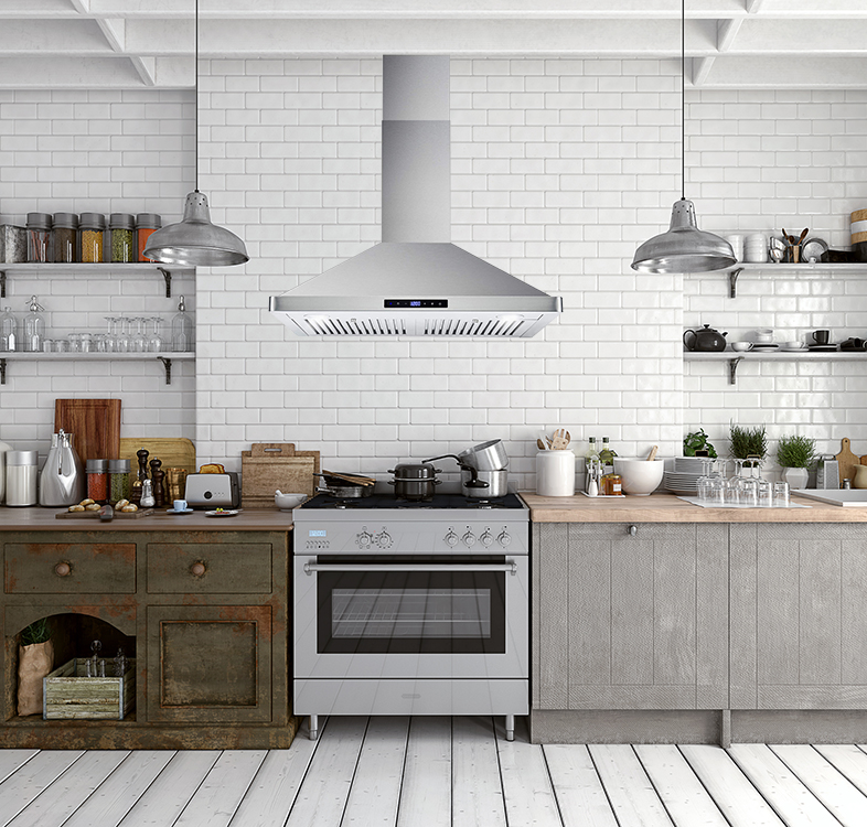 This is a wall mounted range hood is specially designed for the ultimate pro-style kitchen, the pyramid design is one of the client’s favorite features. This kitchen range hood features a 900 CFM ventilation system removes smells and odors with ease for a clean kitchen. It has a 4-speed touch controls and remote control. Moreover, it features 2 LED lights that will illuminate your cooking area. To best remove any unwanted scents and odors, this range hood features dishwasher safe stainless steel baffle filters.