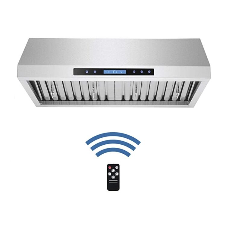 With the powerful blowers, this exhaust under cabinet range hood is made for heavy duty cooking that removes odors, grease and potentially toxic pollutants from the air in your kitchen. The air suction is range from 385CFM to 900CFM with four speeds. It also has a remote control which you can operate your hoods from more than 20ft away.